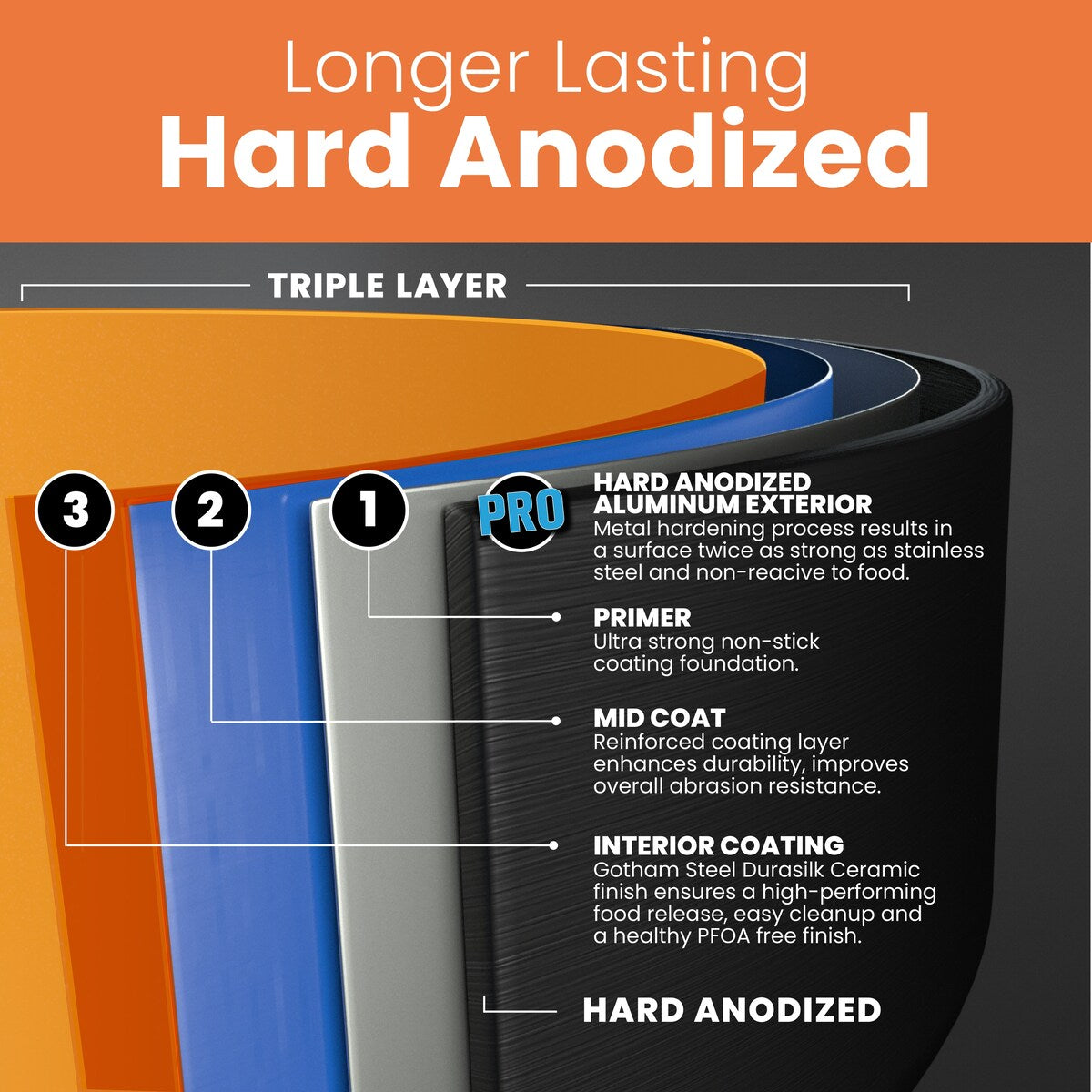 - Anodisé dur : Conçu pour durer, l'ensemble de cuisine Gotham Steel Pro Premier est fabriqué en aluminium anodisé dur, plus résistant que tout acier inoxydable ou aluminium ordinaire, assurant une conduction rapide et uniforme de la chaleur à travers les ustensiles de cuisine, tout en résistant à l'usure et en garantissant des années d'utilisation exceptionnelle de chaque ustensile de cuisine.