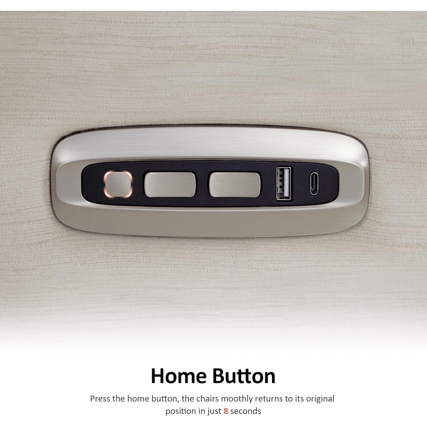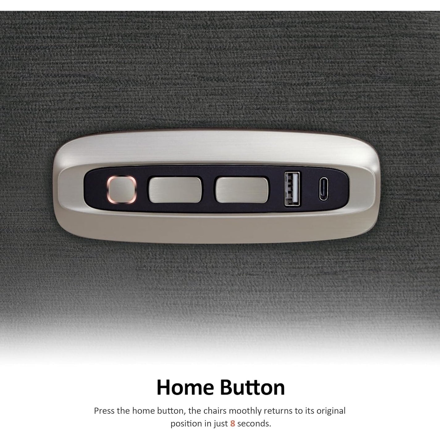 • User-Friendly Controller. Press the home button, and the chair smoothly returns to its original position in just 8 seconds. The dual USB&Type C charge ports on armrest mean that any phone or pad is applicable