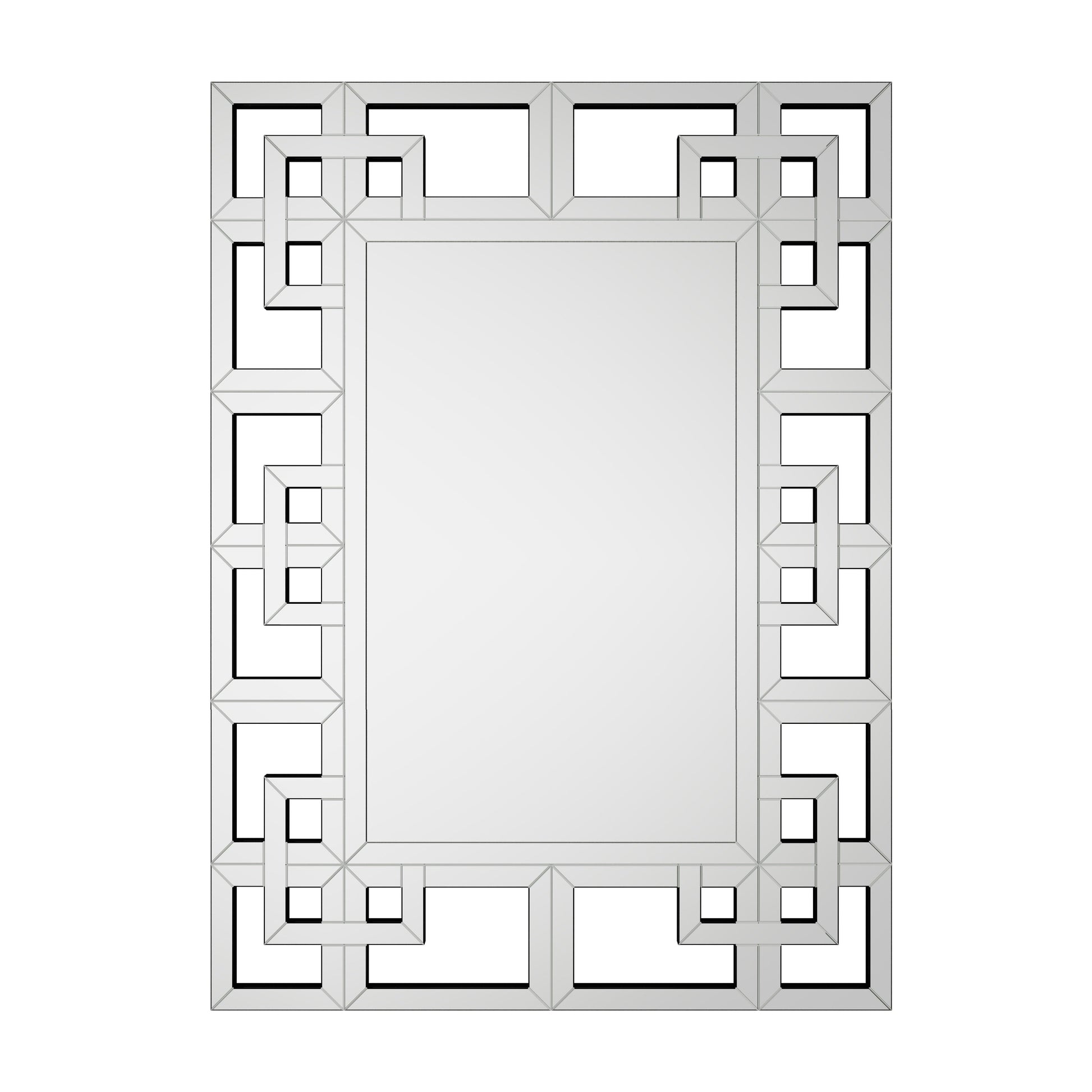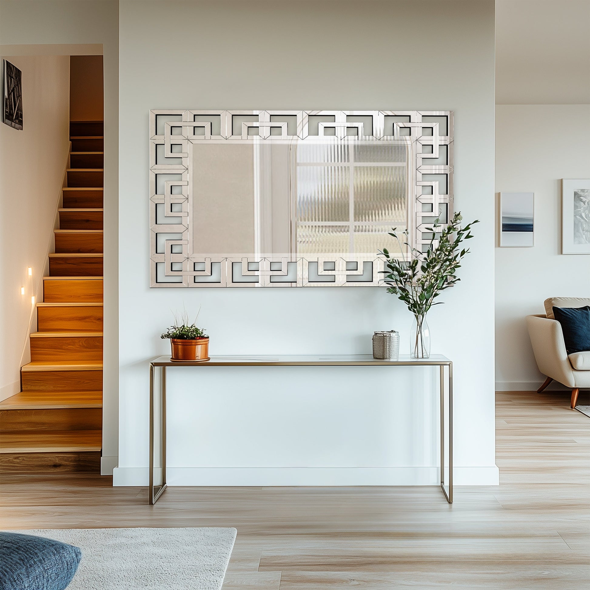 Grand miroir décoratif mural avec cadre géométrique argenté.