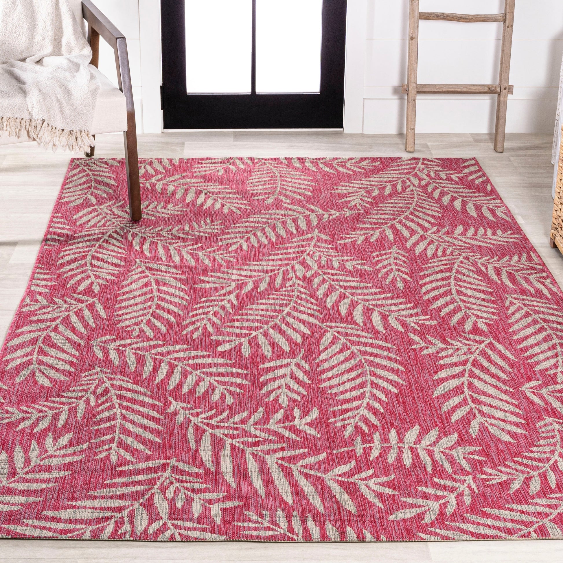 Bring a touch of the tropics to your indoor or outdoor space with the Galon Palm Frond Area Rug by JONATHAN Y. The allover palm frond pattern features scattered palm branches in contrasting colors, creating a busy yet stylish design. Ideal for your tropical patio, entryway, kitchen, hallway, living room or bedroom, this rug's flatweave construction is made of 100% durable and easy-care polypropylene. Kid-proof and pet-friendly, simply sweep or hose it down with mild soap and water. Available in multiple sizes and colors, this rug is power-loomed in Turkey and has a thickness of 0.19 inches.