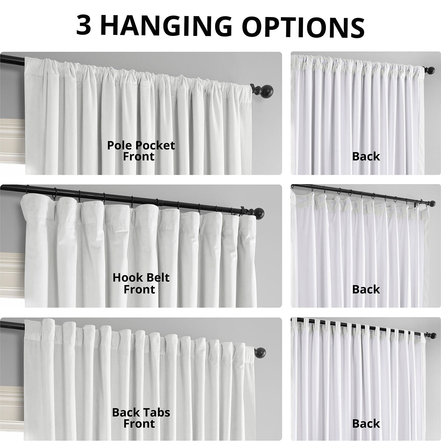• Versatile Hanging Options: With pole pocket, back tab, and hook belt, they offer flexibility in hanging styles to fit different looks and functionalities.